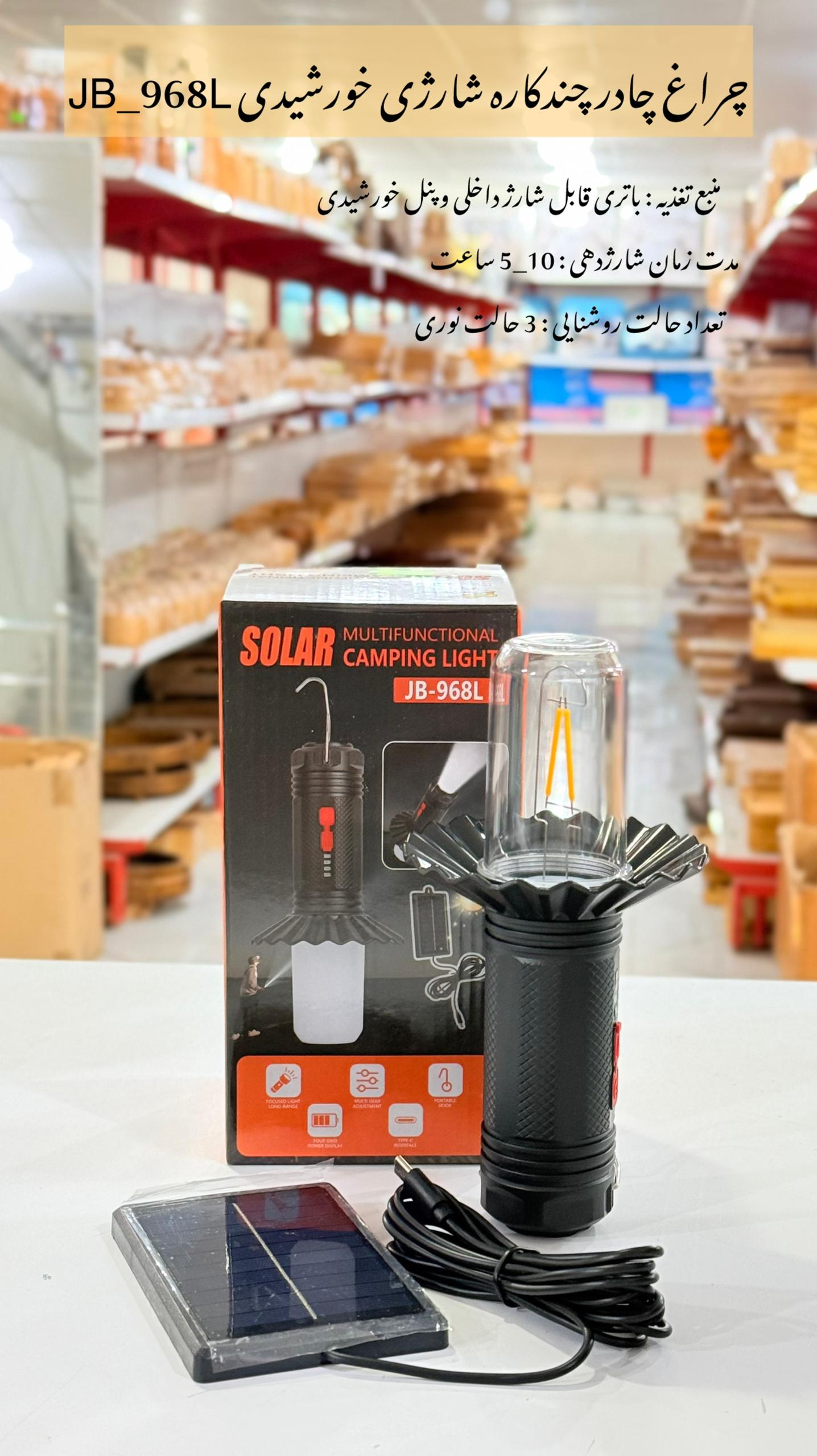 چراغ کمپینگ چندکاره خورشیدی مدل JB_968L، همراهی بینظیر برای تمام ماجراجوییهای شماست! این چراغ با ترکیبی از فناوری پیشرفته و طراحی مقاوم، مناسب استفاده در شرایط مختلف فضای باز است. با وجود پنل خورشیدی، حتی در نبود برق نیز خیالتان از روشنایی آسوده خواهد بود. این محصولد. جنس بدنهی مقاوم و ضدآب آن، استفاده در محیطهای چالشبرانگیز را تضمین میکند. اگر به دنبال چراغی هستید که تمامی نیازهای کمپینگ و سفر شما را پوشش دهد، JB_968L بهترین انتخاب است! داری یک چراغ قوه در زیر خود و یک لامپ در بالای خود دارد که میتونید از این محصول به عنوان هم چراغ دستی و هم آویز استفاده کنید این محصول با طراحی جذابش خودش تبدیل به یکی از بهترین چراغ های کمپینگ شده
