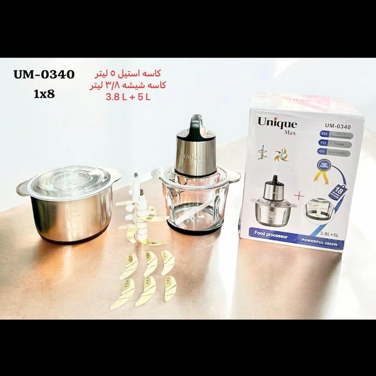 خردکن دو کاسه برند یونیک دارای یک کاسه پیرکس به گنجایش 3.8L و کاسه استیل به گنجایش 5L و درب جدا برای هردو ظرف